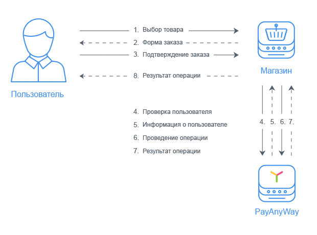 Чтобы провести в системе PayAnyWay финансовую операцию списания со счёта покупателя и зачисления на ваш счёт, обработчик должен послать специальный запрос web-сервису интерфейса Merchant API и обработать ответ с результатом прохождения операции.
